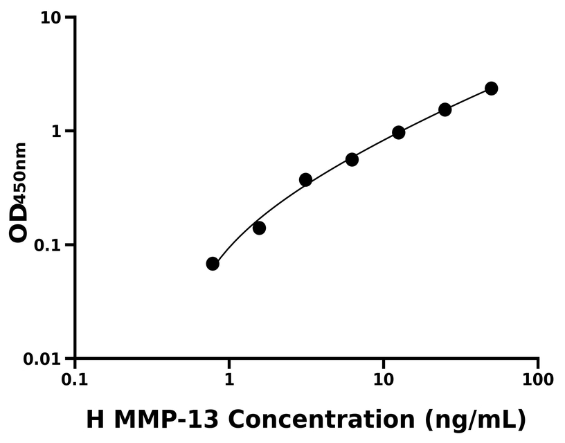 本试剂盒采用双抗体夹心法ELISA技术:将捕获抗体包被于酶标板上,捕获样品及标准品中的待测物MMP-13,清洗后,再加入生物素标记的检测抗体进行孵育后清洗,形成“捕获抗体-抗原-检测抗体”免疫复合物,随后加入链霉亲和素偶联的辣根过氧化物酶进行孵育,待孵育结束后清洗,接着加入TMB显色后,若样本中有待测物则显蓝色,加入终止液停止反应。检测过程中游离的成分均被洗去,用酶标仪在450 nm处测OD值,颜色的深浅和样品中的待测物的含量呈正比,通过绘制标准曲线计算出样本中MMP-13的浓度。