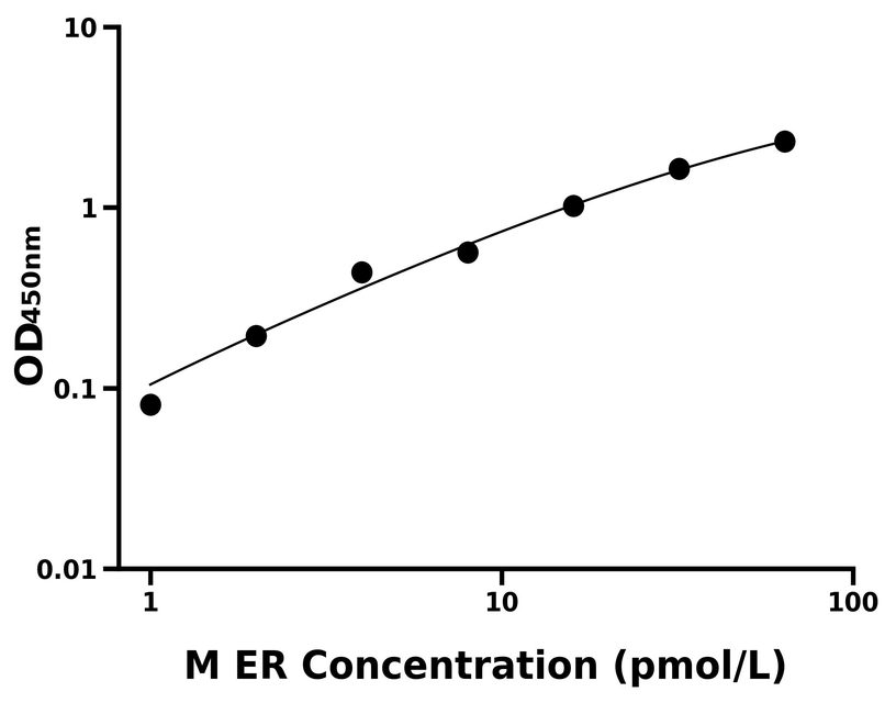 本试剂盒采用双抗体夹心法ELISA技术:将捕获抗体包被于酶标板上,捕获样品及标准品中的待测物ER,清洗后,再加入生物素标记的检测抗体进行孵育后清洗,形成“捕获抗体-抗原-检测抗体”免疫复合物,随后加入链霉亲和素偶联的辣根过氧化物酶进行孵育,待孵育结束后清洗,接着加入TMB显色后,若样本中有待测物则显蓝色,加入终止液停止反应。检测过程中游离的成分均被洗去,用酶标仪在450 nm处测OD值,颜色的深浅和样品中的待测物的含量呈正比,通过绘制标准曲线计算出样本中ER的浓度。