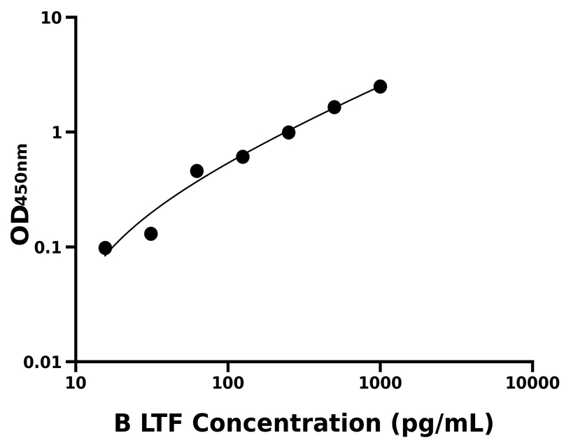本试剂盒采用双抗体夹心法ELISA技术:将捕获抗体包被于酶标板上,捕获样品及标准品中的待测物LTF,清洗后,再加入生物素标记的检测抗体进行孵育后清洗,形成“捕获抗体-抗原-检测抗体”免疫复合物,随后加入链霉亲和素偶联的辣根过氧化物酶进行孵育,待孵育结束后清洗,接着加入TMB显色后,若样本中有待测物则显蓝色,加入终止液停止反应。检测过程中游离的成分均被洗去,用酶标仪在450 nm处测OD值,颜色的深浅和样品中的待测物的含量呈正比,通过绘制标准曲线计算出样本中LTF的浓度。