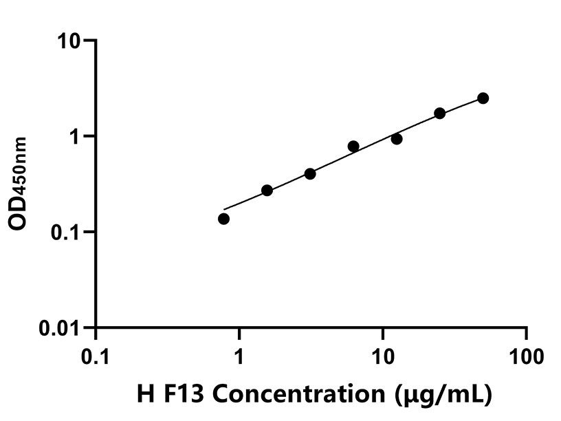 本试剂盒采用双抗体夹心法ELISA技术:将捕获抗体包被于酶标板上,捕获样品及标准品中的待测物F13,清洗后,再加入生物素标记的检测抗体进行孵育后清洗,形成“捕获抗体-抗原-检测抗体”免疫复合物,随后加入链霉亲和素偶联的辣根过氧化物酶进行孵育,待孵育结束后清洗,接着加入TMB显色后,若样本中有待测物则显蓝色,加入终止液停止反应。检测过程中游离的成分均被洗去,用酶标仪在450 nm处测OD值,颜色的深浅和样品中的待测物的含量呈正比,通过绘制标准曲线计算出样本中F13的浓度。