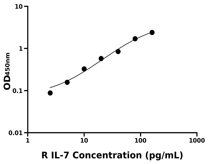 本试剂盒采用双抗体夹心法ELISA技术:将捕获抗体包被于酶标板上,捕获样品及标准品中的待测物IL-7,清洗后,再加入生物素标记的检测抗体进行孵育后清洗,形成“捕获抗体-抗原-检测抗体”免疫复合物,随后加入链霉亲和素偶联的辣根过氧化物酶进行孵育,待孵育结束后清洗,接着加入TMB显色后,若样本中有待测物则显蓝色,加入终止液停止反应。检测过程中游离的成分均被洗去,用酶标仪在450 nm处测OD值,颜色的深浅和样品中的待测物的含量呈正比,通过绘制标准曲线计算出样本中IL-7的浓度。