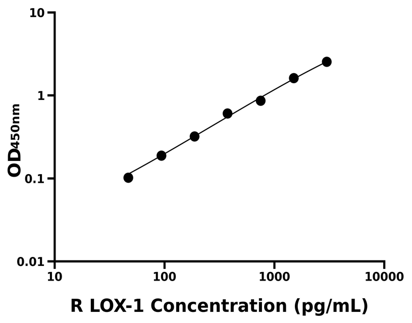 本试剂盒采用双抗体夹心法ELISA技术:将捕获抗体包被于酶标板上,捕获样品及标准品中的待测物LOX-1,清洗后,再加入生物素标记的检测抗体进行孵育后清洗,形成“捕获抗体-抗原-检测抗体”免疫复合物,随后加入链霉亲和素偶联的辣根过氧化物酶进行孵育,待孵育结束后清洗,接着加入TMB显色后,若样本中有待测物则显蓝色,加入终止液停止反应。检测过程中游离的成分均被洗去,用酶标仪在450 nm处测OD值,颜色的深浅和样品中的待测物的含量呈正比,通过绘制标准曲线计算出样本中LOX-1的浓度。