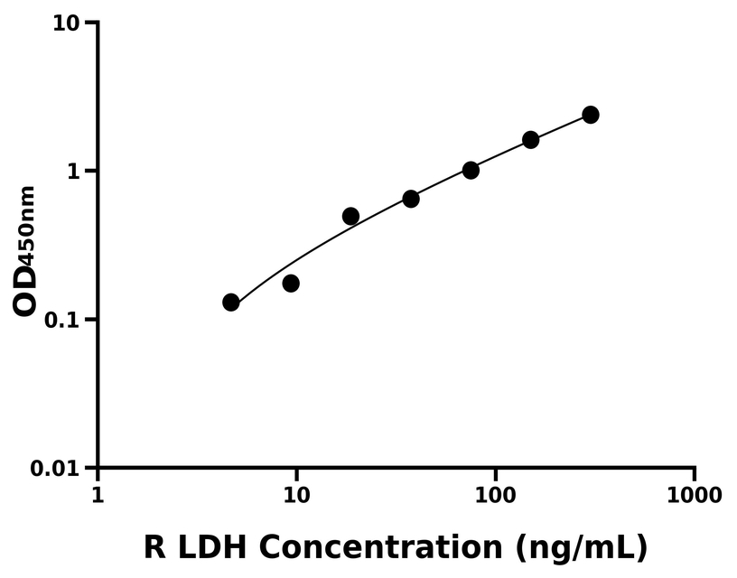 本试剂盒采用双抗体夹心法ELISA技术:将捕获抗体包被于酶标板上,捕获样品及标准品中的待测物LDH,清洗后,再加入生物素标记的检测抗体进行孵育后清洗,形成“捕获抗体-抗原-检测抗体”免疫复合物,随后加入链霉亲和素偶联的辣根过氧化物酶进行孵育,待孵育结束后清洗,接着加入TMB显色后,若样本中有待测物则显蓝色,加入终止液停止反应。检测过程中游离的成分均被洗去,用酶标仪在450 nm处测OD值,颜色的深浅和样品中的待测物的含量呈正比,通过绘制标准曲线计算出样本中LDH的浓度。