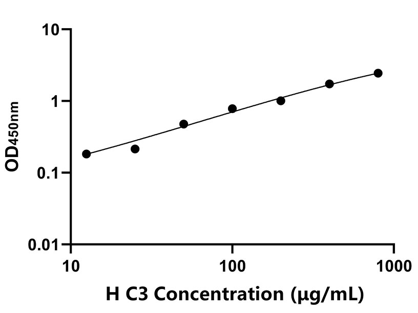 本试剂盒采用双抗体夹心法ELISA技术:将捕获抗体包被于酶标板上,捕获样品及标准品中的待测物C3,清洗后,再加入生物素标记的检测抗体进行孵育后清洗,形成“捕获抗体-抗原-检测抗体”免疫复合物,随后加入链霉亲和素偶联的辣根过氧化物酶进行孵育,待孵育结束后清洗,接着加入TMB显色后,若样本中有待测物则显蓝色,加入终止液停止反应。检测过程中游离的成分均被洗去,用酶标仪在450 nm处测OD值,颜色的深浅和样品中的待测物的含量呈正比,通过绘制标准曲线计算出样本中C3的浓度。