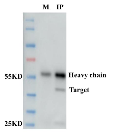 从左往右,泳道依次为Marker,未结合蛋白的磁珠,下拉融合Flag标签的靶标蛋白。