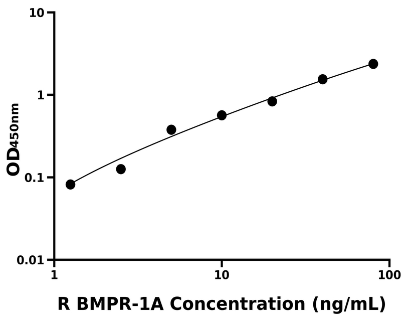 本试剂盒采用双抗体夹心法ELISA技术:将捕获抗体包被于酶标板上,捕获样品及标准品中的待测物BMPR-1A,清洗后,再加入生物素标记的检测抗体进行孵育后清洗,形成“捕获抗体-抗原-检测抗体”免疫复合物,随后加入链霉亲和素偶联的辣根过氧化物酶进行孵育,待孵育结束后清洗,接着加入TMB显色后,若样本中有待测物则显蓝色,加入终止液停止反应。检测过程中游离的成分均被洗去,用酶标仪在450 nm处测OD值,颜色的深浅和样品中的待测物的含量呈正比,通过绘制标准曲线计算出样本中BMPR-1A的浓度。
