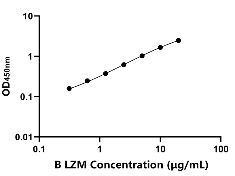 本试剂盒采用双抗体夹心法ELISA技术:将捕获抗体包被于酶标板上,捕获样品及标准品中的待测物LZM,清洗后,再加入生物素标记的检测抗体进行孵育后清洗,形成“捕获抗体-抗原-检测抗体”免疫复合物,随后加入链霉亲和素偶联的辣根过氧化物酶进行孵育,待孵育结束后清洗,接着加入TMB显色后,若样本中有待测物则显蓝色,加入终止液停止反应。检测过程中游离的成分均被洗去,用酶标仪在450 nm处测OD值,颜色的深浅和样品中的待测物的含量呈正比,通过绘制标准曲线计算出样本中LZM的浓度。