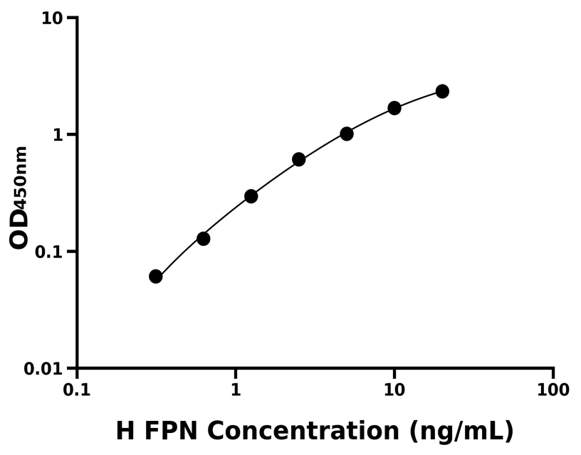本试剂盒采用双抗体夹心法ELISA技术:将捕获抗体包被于酶标板上,捕获样品及标准品中的待测物FPN,清洗后,再加入生物素标记的检测抗体进行孵育后清洗,形成“捕获抗体-抗原-检测抗体”免疫复合物,随后加入链霉亲和素偶联的辣根过氧化物酶进行孵育,待孵育结束后清洗,接着加入TMB显色后,若样本中有待测物则显蓝色,加入终止液停止反应。检测过程中游离的成分均被洗去,用酶标仪在450 nm处测OD值,颜色的深浅和样品中的待测物的含量呈正比,通过绘制标准曲线计算出样本中FPN的浓度。