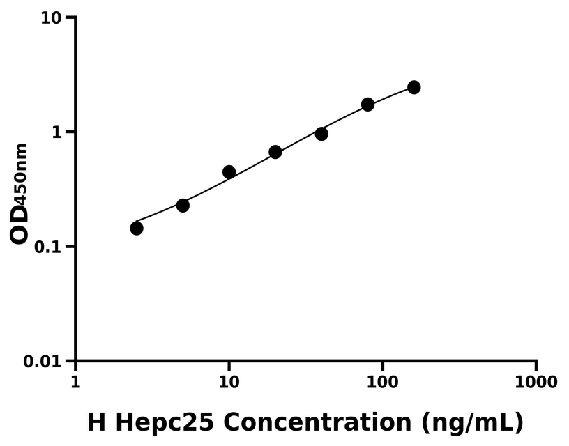 本试剂盒采用双抗体夹心法ELISA技术:将捕获抗体包被于酶标板上,捕获样品及标准品中的待测物Hepc25,清洗后,再加入生物素标记的检测抗体进行孵育后清洗,形成“捕获抗体-抗原-检测抗体”免疫复合物,随后加入链霉亲和素偶联的辣根过氧化物酶进行孵育,待孵育结束后清洗,接着加入TMB显色后,若样本中有待测物则显蓝色,加入终止液停止反应。检测过程中游离的成分均被洗去,用酶标仪在450 nm处测OD值,颜色的深浅和样品中的待测物的含量呈正比,通过绘制标准曲线计算出样本中Hepc25的浓度。