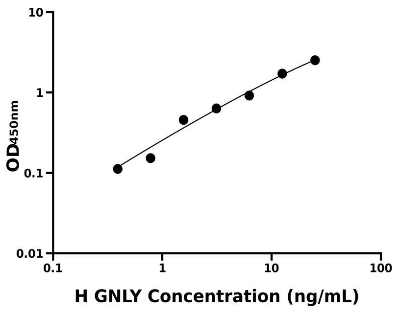 本试剂盒采用双抗体夹心法ELISA技术:将捕获抗体包被于酶标板上,捕获样品及标准品中的待测物GNLY,清洗后,再加入生物素标记的检测抗体进行孵育后清洗,形成“捕获抗体-抗原-检测抗体”免疫复合物,随后加入链霉亲和素偶联的辣根过氧化物酶进行孵育,待孵育结束后清洗,接着加入TMB显色后,若样本中有待测物则显蓝色,加入终止液停止反应。检测过程中游离的成分均被洗去,用酶标仪在450 nm处测OD值,颜色的深浅和样品中的待测物的含量呈正比,通过绘制标准曲线计算出样本中GNLY的浓度。