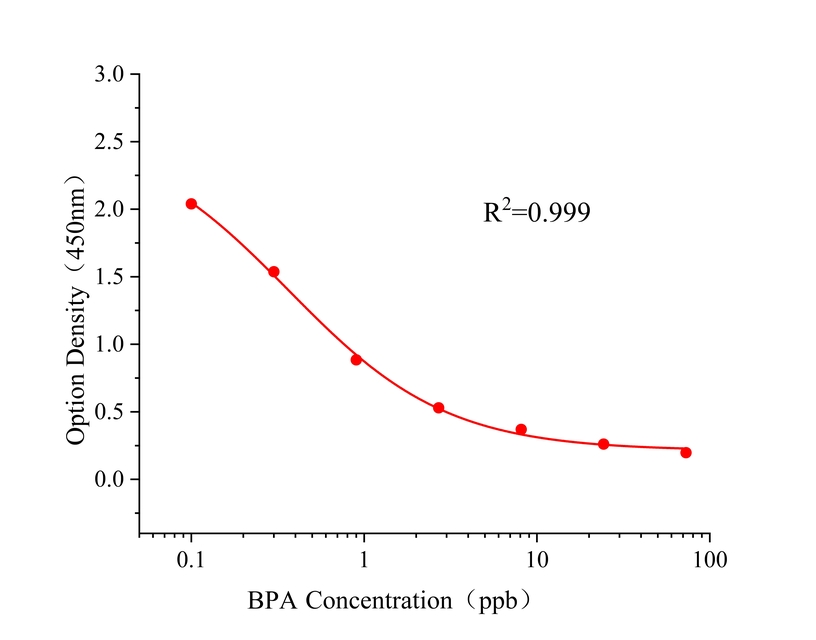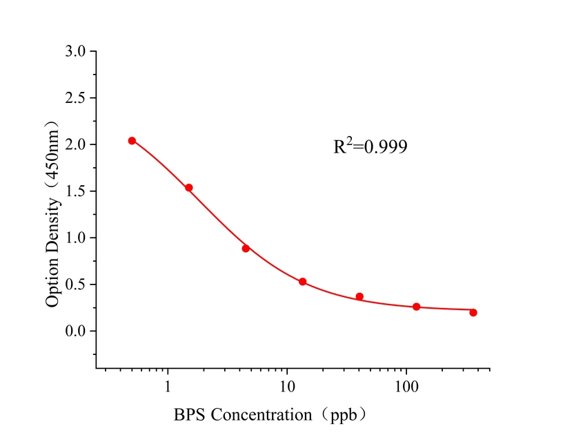 本试剂盒采用间接竞争ELISA方法,在酶标板微孔条上预包被偶联抗原,样本中双酚S和微孔条上预包被的偶联抗原竞争双酚S抗体,加入酶标二抗后,形成包被抗原-抗体-酶标二抗复合物。随后结合的酶催化TMB底物显色,样本吸光值与其含有的双酚S成负相关。通过标准曲线可准确定量样品中双酚S的含量。通过标准曲线计算所得值乘以样品处理的稀释倍数即为实际样品中双酚S的含量。