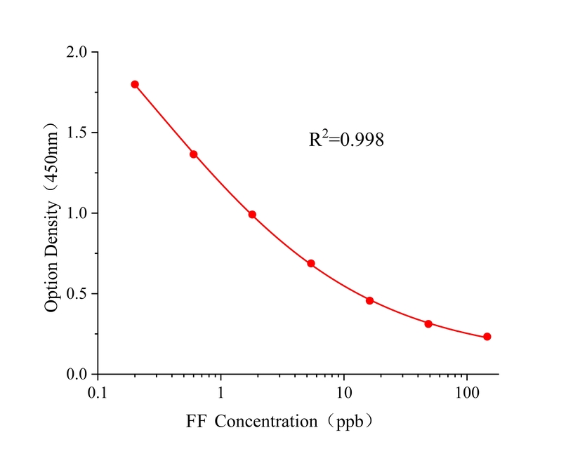 本试剂盒采用间接竞争ELISA方法,在酶标板微孔条上预包被偶联抗原,样本中氟苯尼考和微孔条上预包被的偶联抗原竞争氟苯尼考抗体,加入酶标二抗后,形成包被抗原-抗体-酶标二抗复合物。随后结合的酶催化TMB底物显色,样本吸光值与其含有的氟苯尼考成负相关。通过标准曲线可准确定量样品中氟苯尼考的含量。通过标准曲线计算所得值乘以样品处理的稀释倍数即为实际样品中氟苯尼考的含量。