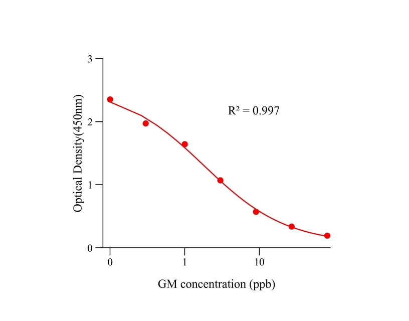 本试剂盒采用间接竞争ELISA方法,在酶标板微孔条上预包被偶联抗原,样本中庆大霉素和微孔条上预包被的偶联抗原竞争庆大霉素抗体,加入酶标二抗后,形成包被抗原-抗体-酶标二抗复合物。随后结合的酶催化TMB底物显色,样本吸光值与其含有的庆大霉素成负相关。通过标准曲线可准确定量样品中庆大霉素的含量。通过标准曲线计算所得值乘以样品处理的稀释倍数即为实际样品中庆大霉素的含量。