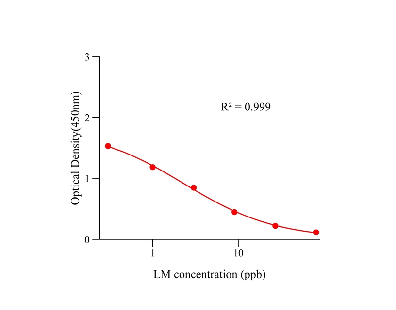 本试剂盒采用间接竞争ELISA方法,在酶标板微孔条上预包被偶联抗原,样本中林可霉素和微孔条上预包被的偶联抗原竞争林可霉素抗体,加入酶标二抗后,形成包被抗原-抗体-酶标二抗复合物。随后结合的酶催化TMB底物显色,样本吸光值与其含有的林可霉素成负相关。通过标准曲线可准确定量样品中林可霉素的含量。通过标准曲线计算所得值乘以样品处理的稀释倍数即为实际样品中林可霉素的含量。