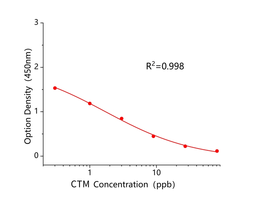 本试剂盒采用间接竞争ELISA方法,在酶标板微孔条上预包被偶联抗原,样本中克拉霉素多残和微孔条上预包被的偶联抗原竞争克拉霉素多残抗体,加入酶标二抗后,形成包被抗原-抗体-酶标二抗复合物。随后结合的酶催化TMB底物显色,样本吸光值与其含有的克拉霉素多残成负相关。通过标准曲线可准确定量样品中克拉霉素多残的含量。通过标准曲线计算所得值乘以样品处理的稀释倍数即为实际样品中克拉霉素多残的含量。