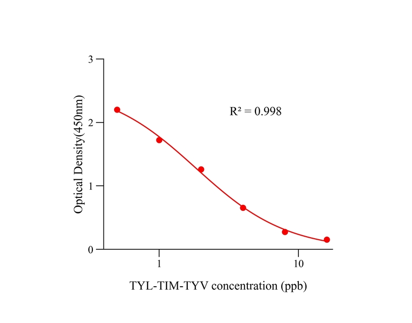 本试剂盒采用间接竞争ELISA方法,在酶标板微孔条上预包被偶联抗原,样本中泰乐/替米/泰万三合一和微孔条上预包被的偶联抗原竞争泰乐/替米/泰万三合一抗体,加入酶标二抗后,形成包被抗原-抗体-酶标二抗复合物。随后结合的酶催化TMB底物显色,样本吸光值与其含有的泰乐/替米/泰万三合一成负相关。通过标准曲线可准确定量样品中泰乐/替米/泰万三合一的含量。通过标准曲线计算所得值乘以样品处理的稀释倍数即为实际样品中泰乐/替米/泰万三合一的含量。