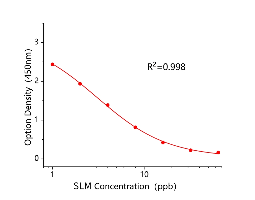 本试剂盒采用间接竞争ELISA方法,在酶标板微孔条上预包被偶联抗原,样本中盐霉素和微孔条上预包被的偶联抗原竞争盐霉素抗体,加入酶标二抗后,形成包被抗原-抗体-酶标二抗复合物。随后结合的酶催化TMB底物显色,样本吸光值与其含有的盐霉素成负相关。通过标准曲线可准确定量样品中盐霉素的含量。通过标准曲线计算所得值乘以样品处理的稀释倍数即为实际样品中盐霉素的含量。