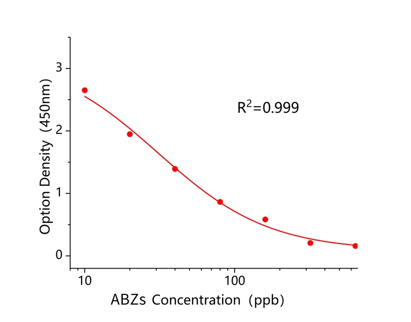 本试剂盒采用间接竞争ELISA方法,在酶标板微孔条上预包被偶联抗原,样本中阿苯达唑多残I和微孔条上预包被的偶联抗原竞争阿苯达唑多残I抗体,加入酶标二抗后,形成包被抗原-抗体-酶标二抗复合物。随后结合的酶催化TMB底物显色,样本吸光值与其含有的阿苯达唑多残I成负相关。通过标准曲线可准确定量样品中阿苯达唑多残I的含量。通过标准曲线计算所得值乘以样品处理的稀释倍数即为实际样品中阿苯达唑多残I的含量。