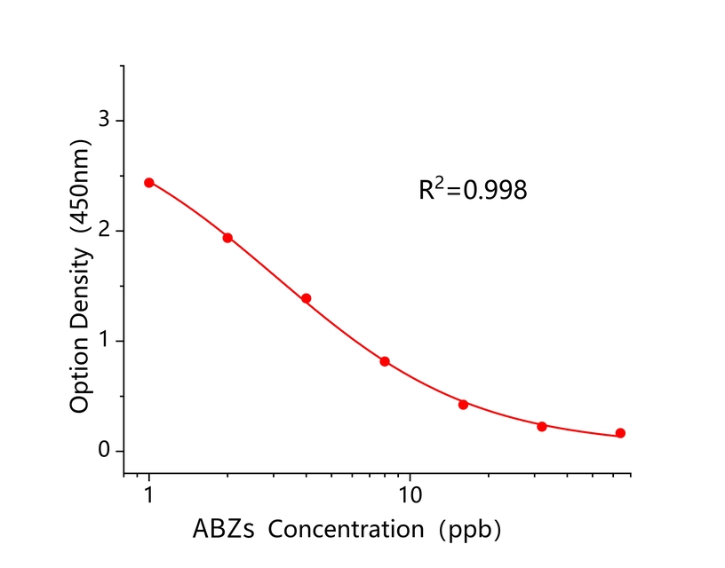 本试剂盒采用间接竞争ELISA方法,在酶标板微孔条上预包被偶联抗原,样本中阿苯达唑多残II和微孔条上预包被的偶联抗原竞争阿苯达唑多残II抗体,加入酶标二抗后,形成包被抗原-抗体-酶标二抗复合物。随后结合的酶催化TMB底物显色,样本吸光值与其含有的阿苯达唑多残II成负相关。通过标准曲线可准确定量样品中阿苯达唑多残II的含量。通过标准曲线计算所得值乘以样品处理的稀释倍数即为实际样品中阿苯达唑多残II的含量。