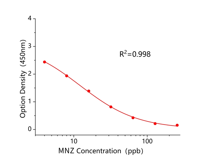 本试剂盒采用间接竞争ELISA方法,在酶标板微孔条上预包被偶联抗原,样本中甲硝唑和微孔条上预包被的偶联抗原竞争甲硝唑抗体,加入酶标二抗后,形成包被抗原-抗体-酶标二抗复合物。随后结合的酶催化TMB底物显色,样本吸光值与其含有的甲硝唑成负相关。通过标准曲线可准确定量样品中甲硝唑的含量。通过标准曲线计算所得值乘以样品处理的稀释倍数即为实际样品中甲硝唑的含量。