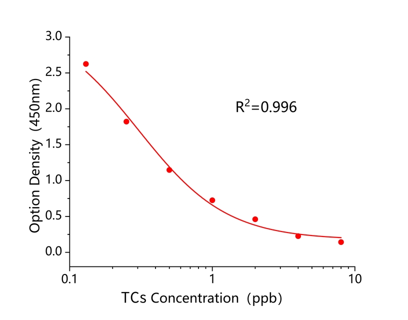 本试剂盒采用间接竞争ELISA方法,在酶标板微孔条上预包被偶联抗原,样本中四环素和微孔条上预包被的偶联抗原竞争四环素抗体,加入酶标二抗后,形成包被抗原-抗体-酶标二抗复合物。随后结合的酶催化TMB底物显色,样本吸光值与其含有的四环素成负相关。通过标准曲线可准确定量样品中四环素的含量。通过标准曲线计算所得值乘以样品处理的稀释倍数即为实际样品中四环素的含量。