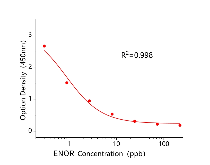 本试剂盒采用间接竞争ELISA方法,在酶标板微孔条上预包被偶联抗原,样本中恩诺沙星和微孔条上预包被的偶联抗原竞争恩诺沙星抗体,加入酶标二抗后,形成包被抗原-抗体-酶标二抗复合物。随后结合的酶催化TMB底物显色,样本吸光值与其含有的恩诺沙星成负相关。通过标准曲线可准确定量样品中恩诺沙星的含量。通过标准曲线计算所得值乘以样品处理的稀释倍数即为实际样品中恩诺沙星的含量。
