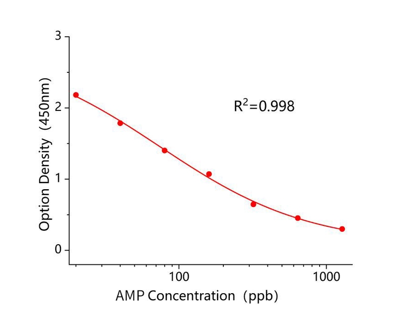 本试剂盒采用间接竞争ELISA方法,在酶标板微孔条上预包被偶联抗原,样本中氨苄西林和微孔条上预包被的偶联抗原竞争氨苄西林抗体,加入酶标二抗后,形成包被抗原-抗体-酶标二抗复合物。随后结合的酶催化TMB底物显色,样本吸光值与其含有的氨苄西林成负相关。通过标准曲线可准确定量样品中氨苄西林的含量。通过标准曲线计算所得值乘以样品处理的稀释倍数即为实际样品中氨苄西林的含量。