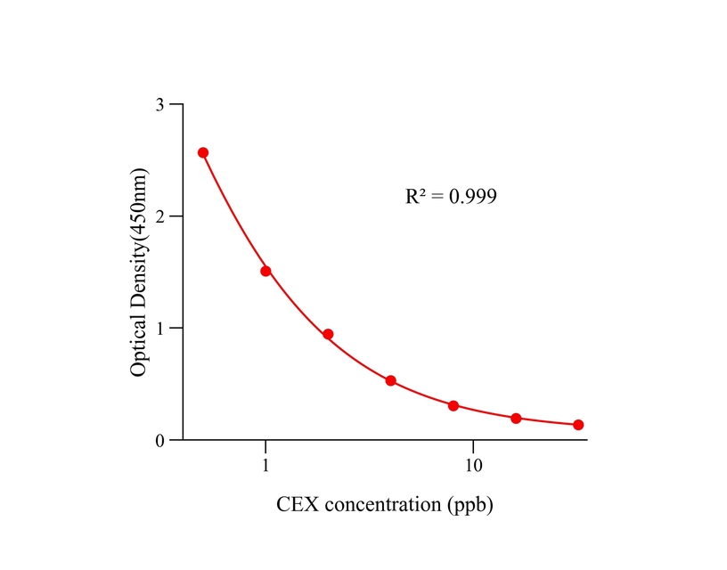 本试剂盒采用间接竞争ELISA方法,在酶标板微孔条上预包被偶联抗原,样本中头孢氨苄和微孔条上预包被的偶联抗原竞争头孢氨苄抗体,加入酶标二抗后,形成包被抗原-抗体-酶标二抗复合物。随后结合的酶催化TMB底物显色,样本吸光值与其含有的头孢氨苄成负相关。通过标准曲线可准确定量样品中头孢氨苄的含量。通过标准曲线计算所得值乘以样品处理的稀释倍数即为实际样品中头孢氨苄的含量。