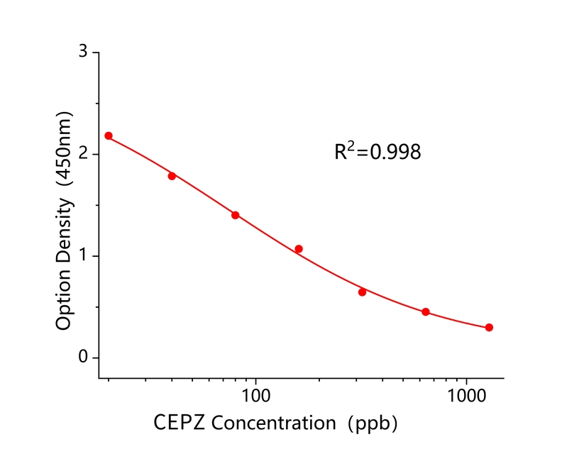 本试剂盒采用间接竞争ELISA方法,在酶标板微孔条上预包被偶联抗原,样本中头孢哌酮和微孔条上预包被的偶联抗原竞争头孢哌酮抗体,加入酶标二抗后,形成包被抗原-抗体-酶标二抗复合物。随后结合的酶催化TMB底物显色,样本吸光值与其含有的头孢哌酮成负相关。通过标准曲线可准确定量样品中头孢哌酮的含量。通过标准曲线计算所得值乘以样品处理的稀释倍数即为实际样品中头孢哌酮的含量。