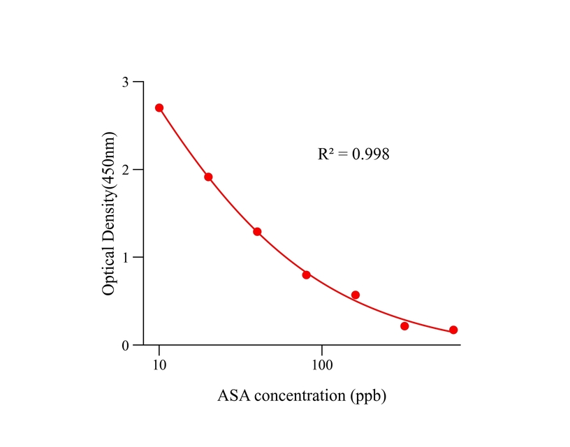 本试剂盒采用间接竞争ELISA方法,在酶标板微孔条上预包被偶联抗原,样本中阿散酸和微孔条上预包被的偶联抗原竞争阿散酸抗体,加入酶标二抗后,形成包被抗原-抗体-酶标二抗复合物。随后结合的酶催化TMB底物显色,样本吸光值与其含有的阿散酸成负相关。通过标准曲线可准确定量样品中阿散酸的含量。通过标准曲线计算所得值乘以样品处理的稀释倍数即为实际样品中阿散酸的含量。