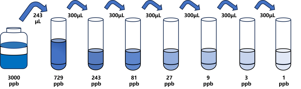 试剂盒中取出标准品,准备7个试管,先将3000ppb标准品(400µL)按需吸取一定量用1×稀释液稀释至729 ppb(例:243µL的标准品母液+757µL的1×稀释液,制备得到1000μL的729 ppb浓度标准品),随后在6个试管中分别加入600μL的1×稀释液,在这6个单独的试管中将729 ppb标准品依次3倍倍比稀释至6个梯度,共配制7个浓度的标准品,依次为:729 ppb、243ppb、81ppb、27ppb、9ppb、3ppb、1ppb,从最高浓度标准品溶液中吸取300μL标准品到下一个试管中,轻轻吹打混匀,以此类推进行标准品的倍比稀释(如图所示),1×稀释液用作零浓度标准品(0ppb)。