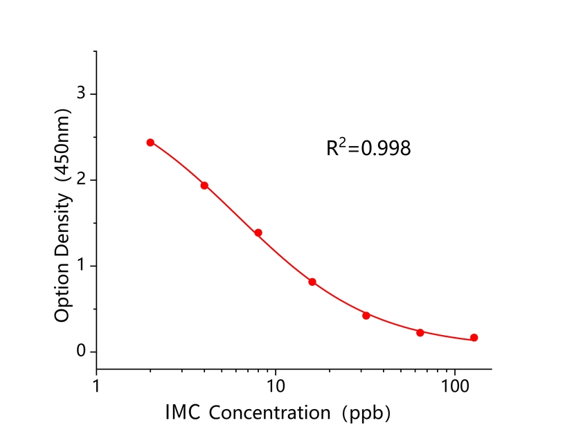 本试剂盒采用间接竞争ELISA方法,在酶标板微孔条上预包被偶联抗原,样本中双咪苯脲和微孔条上预包被的偶联抗原竞争双咪苯脲抗体,加入酶标二抗后,形成包被抗原-抗体-酶标二抗复合物。随后结合的酶催化TMB底物显色,样本吸光值与其含有的双咪苯脲成负相关。通过标准曲线可准确定量样品中双咪苯脲的含量。通过标准曲线计算所得值乘以样品处理的稀释倍数即为实际样品中双咪苯脲的含量。