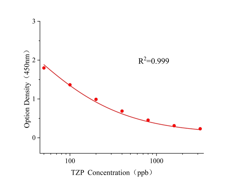 本试剂盒采用间接竞争ELISA方法,在酶标板微孔条上预包被偶联抗原,样本中三唑磷和微孔条上预包被的偶联抗原竞争三唑磷抗体,加入酶标二抗后,形成包被抗原-抗体-酶标二抗复合物。随后结合的酶催化TMB底物显色,样本吸光值与其含有的三唑磷成负相关。通过标准曲线可准确定量样品中三唑磷的含量。通过标准曲线计算所得值乘以样品处理的稀释倍数即为实际样品中三唑磷的含量。