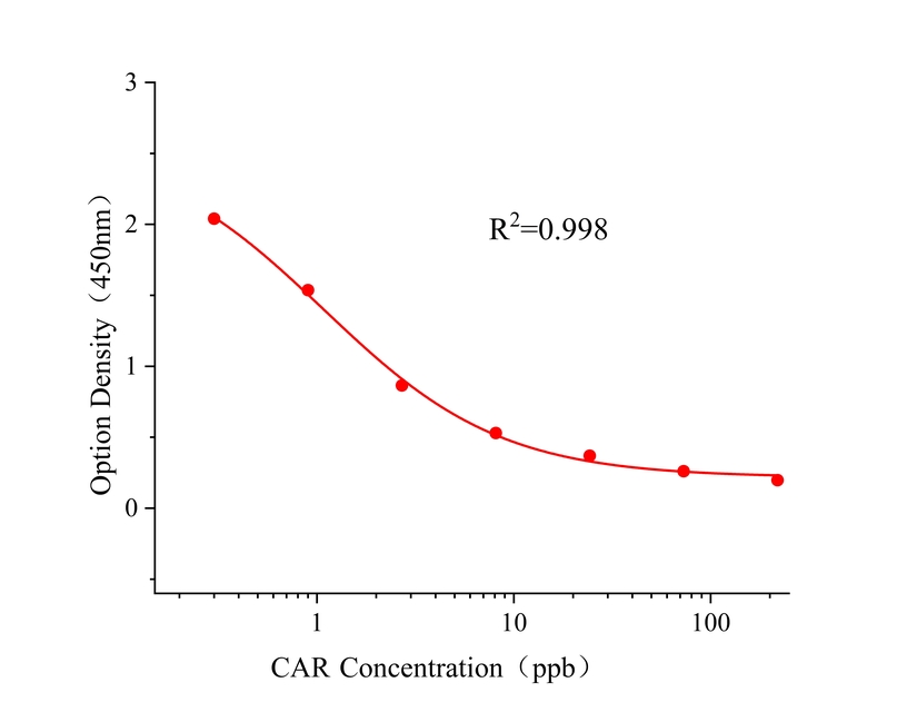本试剂盒采用间接竞争ELISA方法,在酶标板微孔条上预包被偶联抗原,样本中克百威和微孔条上预包被的偶联抗原竞争克百威抗体,加入酶标二抗后,形成包被抗原-抗体-酶标二抗复合物。随后结合的酶催化TMB底物显色,样本吸光值与其含有的克百威成负相关。通过标准曲线可准确定量样品中克百威的含量。通过标准曲线计算所得值乘以样品处理的稀释倍数即为实际样品中克百威的含量。