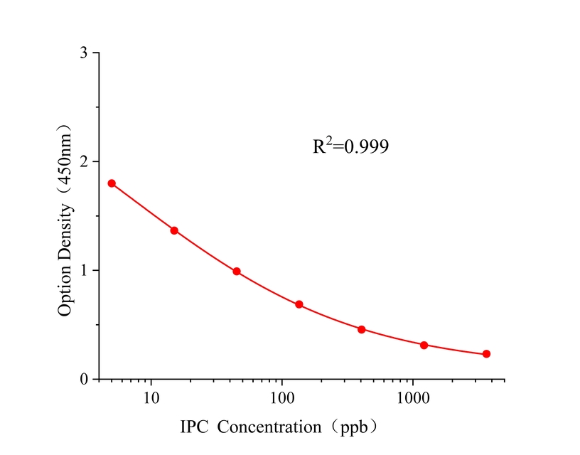 本试剂盒采用间接竞争ELISA方法,在酶标板微孔条上预包被偶联抗原,样本中异丙威和微孔条上预包被的偶联抗原竞争异丙威抗体,加入酶标二抗后,形成包被抗原-抗体-酶标二抗复合物。随后结合的酶催化TMB底物显色,样本吸光值与其含有的异丙威成负相关。通过标准曲线可准确定量样品中异丙威的含量。通过标准曲线计算所得值乘以样品处理的稀释倍数即为实际样品中异丙威的含量。