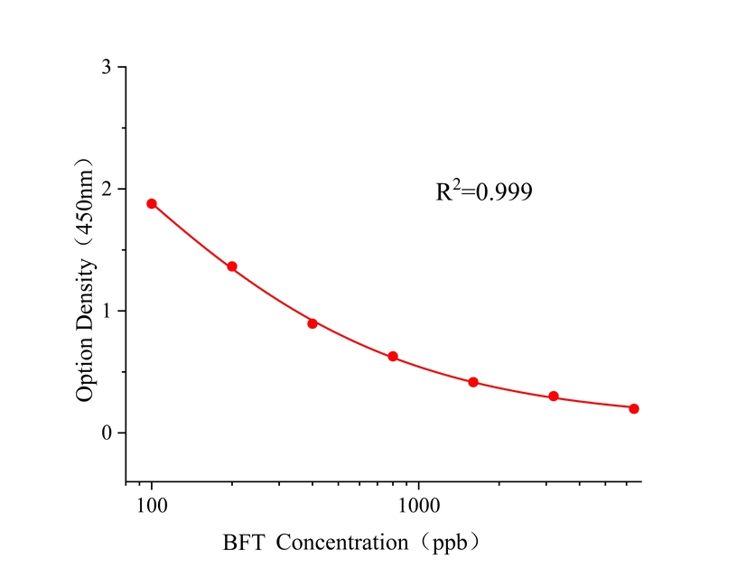 本试剂盒采用间接竞争ELISA方法,在酶标板微孔条上预包被偶联抗原,样本中联苯菊酯和微孔条上预包被的偶联抗原竞争联苯菊酯抗体,加入酶标二抗后,形成包被抗原-抗体-酶标二抗复合物。随后结合的酶催化TMB底物显色,样本吸光值与其含有的联苯菊酯成负相关。通过标准曲线可准确定量样品中联苯菊酯的含量。通过标准曲线计算所得值乘以样品处理的稀释倍数即为实际样品中联苯菊酯的含量。