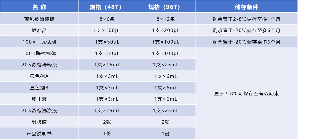 备 注:如样本中待测物浓度高于标准品最高值,请根据实际情况选择适当的稀释倍数 (建议:将待测样本用样品稀释液最低稀释1倍,在正式实验之前做预实验,以确定具体稀释倍数) ;标准品母液及100×酶标二抗溶液根据实验所需酶标板孔数吸取一定量配制工作液,剩余溶液应放回-20℃储存,且避免反复冻融。(若实验在1-2周内做完,标准品母液及100×酶标抗体置于2-8℃保存;若实验为长时间跨度实验,建议将标准品母液及100×酶标抗体置于-20℃保存,以保证实验结果的稳定性)