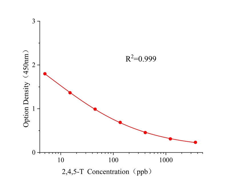 本试剂盒采用间接竞争ELISA方法,在酶标板微孔条上预包被偶联抗原,样本中2,4,5-三氯苯氧乙酸和微孔条上预包被的偶联抗原竞争2,4,5-三氯苯氧乙酸抗体,加入酶标二抗后,形成包被抗原-抗体-酶标二抗复合物。随后结合的酶催化TMB底物显色,样本吸光值与其含有的2,4,5-三氯苯氧乙酸成负相关。通过标准曲线可准确定量样品中2,4,5-三氯苯氧乙酸的含量。通过标准曲线计算所得值乘以样品处理的稀释倍数即为实际样品中2,4,5-三氯苯氧乙酸的含量。