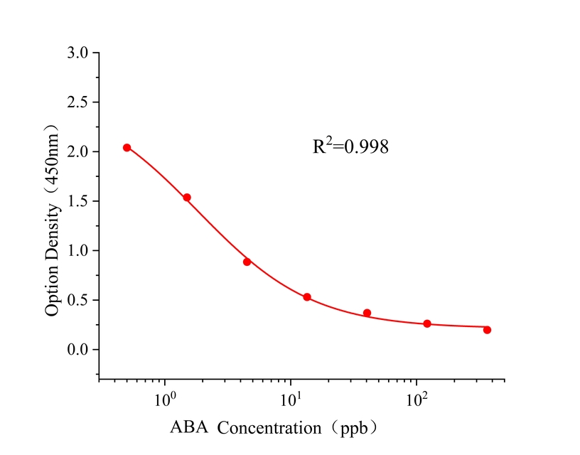 本试剂盒采用间接竞争ELISA方法,在酶标板微孔条上预包被偶联抗原,样本中脱落酸和微孔条上预包被的偶联抗原竞争脱落酸抗体,加入酶标二抗后,形成包被抗原-抗体-酶标二抗复合物。随后结合的酶催化TMB底物显色,样本吸光值与其含有的脱落酸成负相关。通过标准曲线可准确定量样品中脱落酸的含量。通过标准曲线计算所得值乘以样品处理的稀释倍数即为实际样品中脱落酸的含量。