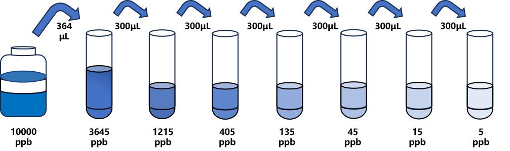 试剂盒中取出标准品,准备7个试管,先将10000 ppb标准品(200µL)按需吸取一定量用1×稀释液稀释至3645 ppb(例:364µL的标准品母液+636µL的1×稀释液,制备得到1000μL的3645 ppb浓度标准品),随后在6个试管中分别加入600μL的1×稀释液,在这6个单独的试管中将3645 ppb标准品依次3倍倍比稀释至7个梯度,共配制7个浓度的标准品,依次为:3645 ppb、1215 ppb、405 ppb、135 ppb、45 ppb、15 ppb、5 ppb,从最高浓度标准品溶液中吸取300μL标准品到下一个试管中,轻轻吹打混匀,以此类推进行标准品的倍比稀释(如图所示),1×稀释液用作零浓度标准品(0ppb)。