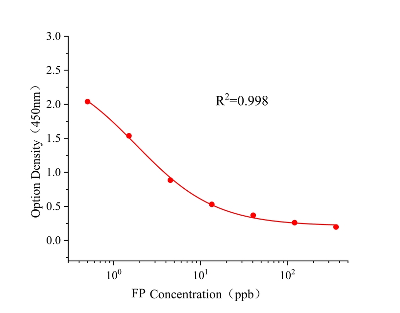 本试剂盒采用间接竞争ELISA方法,在酶标板微孔条上预包被偶联抗原,样本中氟虫腈和微孔条上预包被的偶联抗原竞争氟虫腈抗体,加入酶标二抗后,形成包被抗原-抗体-酶标二抗复合物。随后结合的酶催化TMB底物显色,样本吸光值与其含有的氟虫腈成负相关。通过标准曲线可准确定量样品中氟虫腈的含量。通过标准曲线计算所得值乘以样品处理的稀释倍数即为实际样品中氟虫腈的含量。