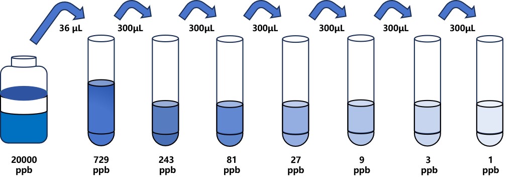 试剂盒中取出标准品,准备7个试管,先将20000 ppb标准品(200µL)按需吸取一定量用1×稀释液稀释至729 ppb(例:36µL的标准品母液+964µL的1×稀释液,制备得到1000μL的729 ppb浓度标准品),随后在6个试管中分别加入600μL的1×稀释液,在这6个单独的试管中将729 ppb标准品依次3倍倍比稀释至7个梯度,共配制7个浓度的标准品,依次为:729 ppb、243 ppb、81 ppb、27 ppb、9 ppb、3 ppb、1 ppb,从最高浓度标准品溶液中吸取300μL标准品到下一个试管中,轻轻吹打混匀,以此类推进行标准品的倍比稀释(如图所示),1×稀释液用作零浓度标准品(0ppb)。