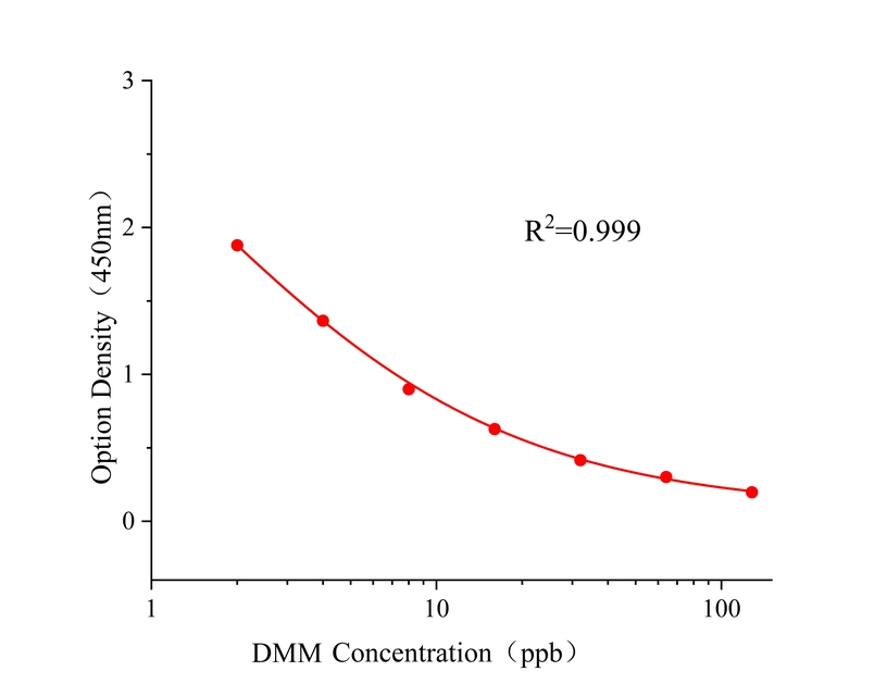 本试剂盒采用间接竞争ELISA方法,在酶标板微孔条上预包被偶联抗原,样本中烯酰吗啉和微孔条上预包被的偶联抗原竞争烯酰吗啉抗体,加入酶标二抗后,形成包被抗原-抗体-酶标二抗复合物。随后结合的酶催化TMB底物显色,样本吸光值与其含有的烯酰吗啉成负相关。通过标准曲线可准确定量样品中烯酰吗啉的含量。通过标准曲线计算所得值乘以样品处理的稀释倍数即为实际样品中烯酰吗啉的含量。