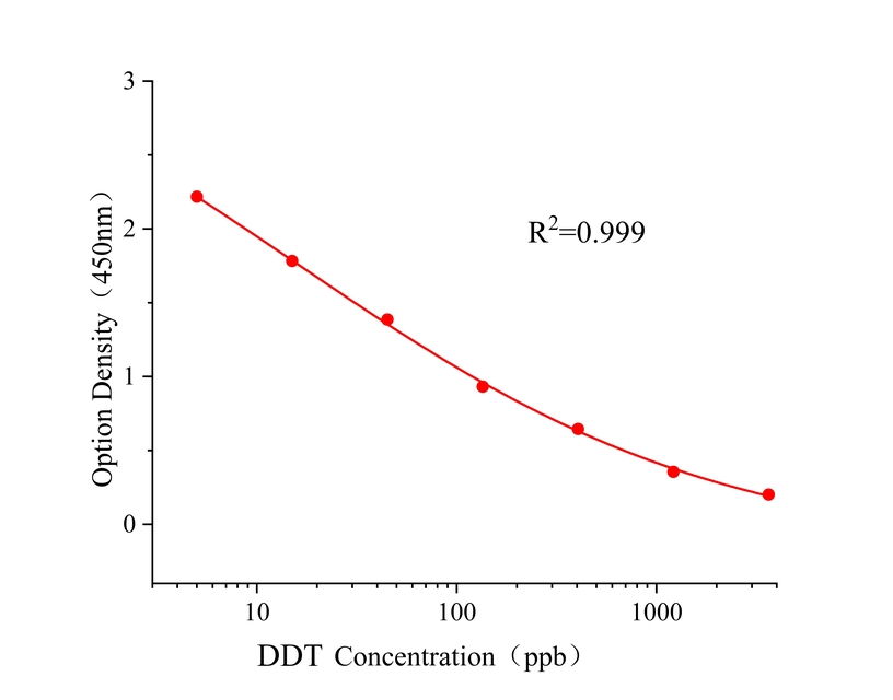 本试剂盒采用间接竞争ELISA方法,在酶标板微孔条上预包被偶联抗原,样本中滴滴涕和微孔条上预包被的偶联抗原竞争滴滴涕抗体,加入酶标二抗后,形成包被抗原-抗体-酶标二抗复合物。随后结合的酶催化TMB底物显色,样本吸光值与其含有的滴滴涕成负相关。通过标准曲线可准确定量样品中滴滴涕的含量。通过标准曲线计算所得值乘以样品处理的稀释倍数即为实际样品中滴滴涕的含量。
