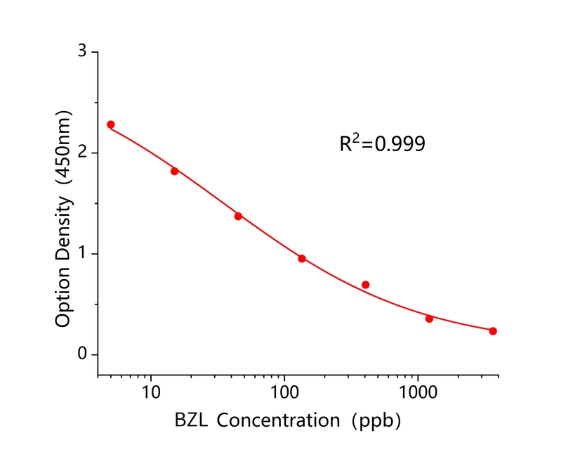 本试剂盒采用间接竞争ELISA方法,在酶标板微孔条上预包被偶联抗原,样本中草除灵和微孔条上预包被的偶联抗原竞争草除灵抗体,加入酶标二抗后,形成包被抗原-抗体-酶标二抗复合物。随后结合的酶催化TMB底物显色,样本吸光值与其含有的草除灵成负相关。通过标准曲线可准确定量样品中草除灵的含量。通过标准曲线计算所得值乘以样品处理的稀释倍数即为实际样品中草除灵的含量。