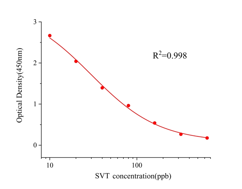 本试剂盒采用间接竞争ELISA方法,在酶标板微孔条上预包被偶联抗原,样本中辛伐他汀和微孔条上预包被的偶联抗原竞争辛伐他汀抗体,加入酶标二抗后,形成包被抗原-抗体-酶标二抗复合物。随后结合的酶催化TMB底物显色,样本吸光值与其含有的辛伐他汀成负相关。通过标准曲线可准确定量样品中辛伐他汀的含量。通过标准曲线计算所得值乘以样品处理的稀释倍数即为实际样品中辛伐他汀的含量。