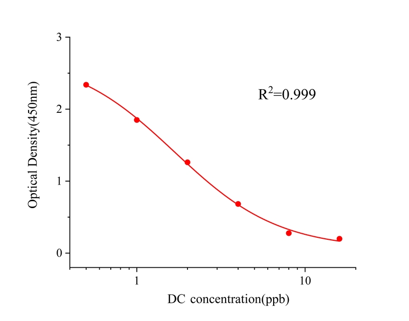 本试剂盒采用间接竞争ELISA方法,在酶标板微孔条上预包被偶联抗原,样本中双氯芬酸和微孔条上预包被的偶联抗原竞争双氯芬酸抗体,加入酶标二抗后,形成包被抗原-抗体-酶标二抗复合物。随后结合的酶催化TMB底物显色,样本吸光值与其含有的双氯芬酸成负相关。通过标准曲线可准确定量样品中双氯芬酸的含量。通过标准曲线计算所得值乘以样品处理的稀释倍数即为实际样品中双氯芬酸的含量。