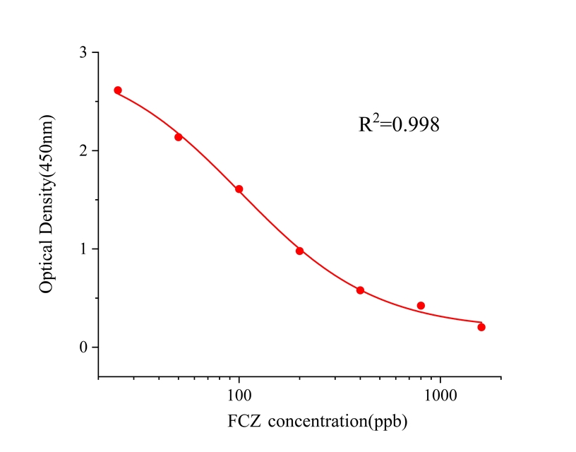 本试剂盒采用间接竞争ELISA方法,在酶标板微孔条上预包被偶联抗原,样本中氟康唑和微孔条上预包被的偶联抗原竞争氟康唑抗体,加入酶标二抗后,形成包被抗原-抗体-酶标二抗复合物。随后结合的酶催化TMB底物显色,样本吸光值与其含有的氟康唑成负相关。通过标准曲线可准确定量样品中氟康唑的含量。通过标准曲线计算所得值乘以样品处理的稀释倍数即为实际样品中氟康唑的含量。