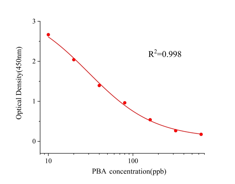 本试剂盒采用间接竞争ELISA方法,在酶标板微孔条上预包被偶联抗原,样本中苯巴比妥和微孔条上预包被的偶联抗原竞争苯巴比妥抗体,加入酶标二抗后,形成包被抗原-抗体-酶标二抗复合物。随后结合的酶催化TMB底物显色,样本吸光值与其含有的苯巴比妥成负相关。通过标准曲线可准确定量样品中苯巴比妥的含量。通过标准曲线计算所得值乘以样品处理的稀释倍数即为实际样品中苯巴比妥的含量。