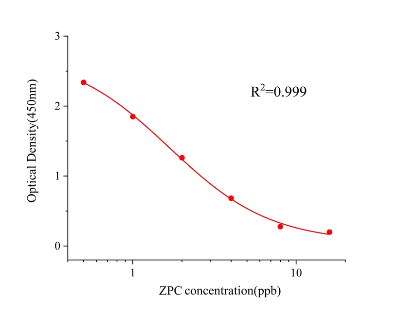 本试剂盒采用间接竞争ELISA方法,在酶标板微孔条上预包被偶联抗原,样本中佐匹克隆和微孔条上预包被的偶联抗原竞争佐匹克隆抗体,加入酶标二抗后,形成包被抗原-抗体-酶标二抗复合物。随后结合的酶催化TMB底物显色,样本吸光值与其含有的佐匹克隆成负相关。通过标准曲线可准确定量样品中佐匹克隆的含量。通过标准曲线计算所得值乘以样品处理的稀释倍数即为实际样品中佐匹克隆的含量。